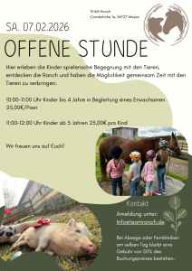 Hier erleben die Kinder spielerische Begegnungen mit den Tieren, entdecken die Ranch und haben die Möglichkeit gemeinsam Zeit mit den Tieren zuverbringen.
