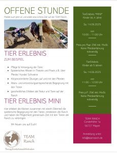 Kinder ab 5 Jahren entdecken spielerisch die Ranch, lernen die Tiere kennen, pflegen und versorgen sie.